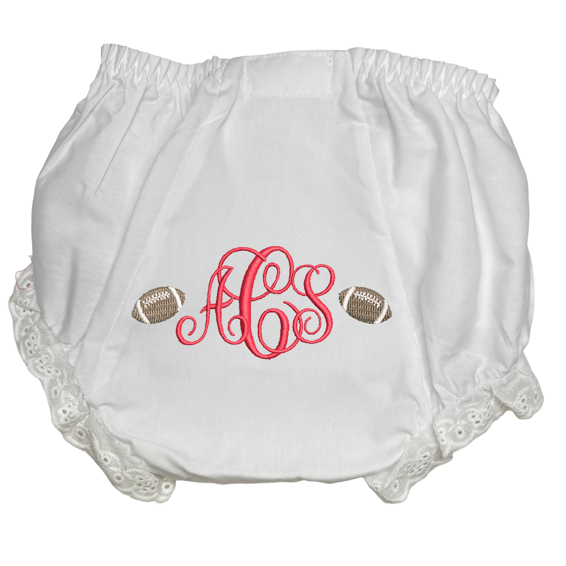 Brown gingham dress features child's monogram with a baby razorback and football.